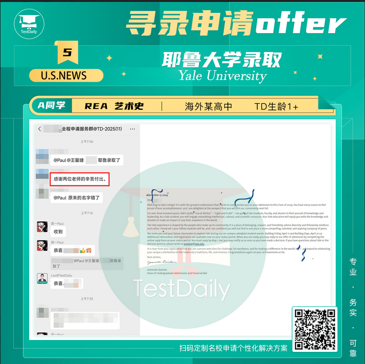 特别令人动容的是,本届案例库中闪耀着诸多"TD世家"的身影。从SAT备考时的青涩模样,到本科申请季的破茧成蝶,再到如今手握常春藤硕士offer的从容自信,我们见证着孩子们人生每个关键节点的华丽蜕变。在TD的教育图景里,每个案例都是独一无二的一段故事。当我们重温那些被泪水或欢笑浸润的成长故事,我们忽然懂得:真正的教育,从来不是靠技巧堆砌的录取数字,而是用岁月酿造的信任与温度。