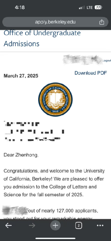 同学A对于加州申请也比较佛系,我通过对话和她的CA文书中发掘闪光点,也让她成为所在高中唯一斩获UCB Offer的中国学生。