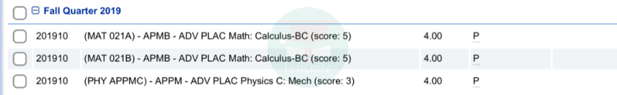 就拿热门专业也是我的专业——应用数学来讲,因为我在AP微积分AB&BC上都取得了5分,就我们学校的数学课程来说,如果AP微积分AB和BC取得了4分或者5分的话是可以同时抵学分以及分别抵掉两节数学课的;如果是3分,这个AP的分数只能加到你的毕业总学分当中,但是不能抵消课,专业要求的课程还是建议重新上。