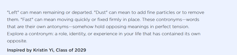 “Left”可以表示“留下”或“离开”;“Dust”既可以表示“撒上尘土”,也可以表示“清除尘土”;“Fast”既可以是“迅速”,也可以是“固定不动”。这些自反义词(contronym)同时拥有彼此相反的含义,却奇妙地保持平衡。请结合你自身经历,探索一个具有这种“自反性”的角色、身份或经历——它是如何同时包含两个对立面的?