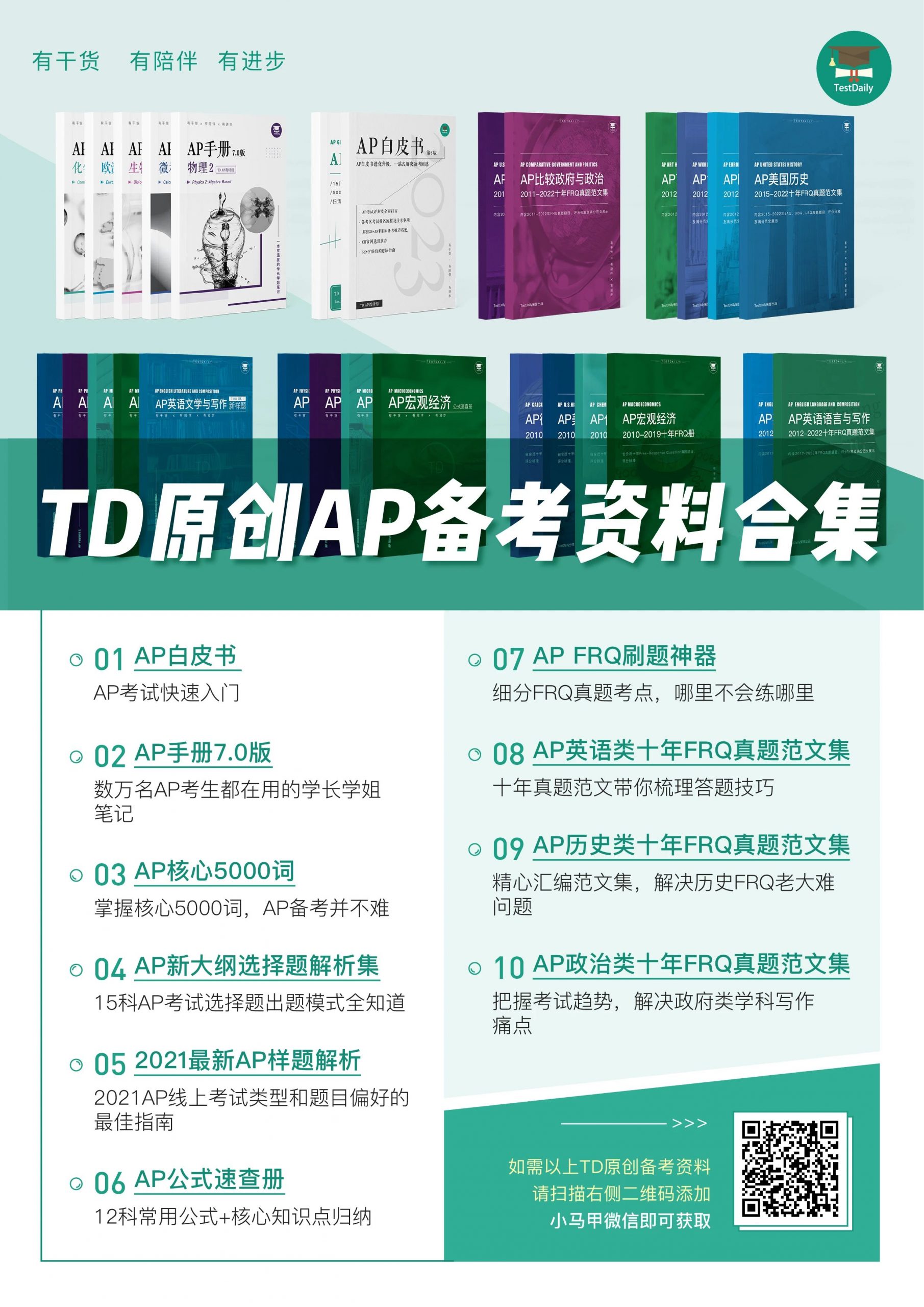 心动不如快速行动,如果同学们想获取最全的AP备考资料,想最快最及时地收到AP资讯,想备考路上不孤军奋战,那就快加入到TD的AP备考交流群中吧!扫描下方二维码添加小马甲微信,发送【AP资料】即可入群,更有丰富的免费资料与免费备考活动等你来~