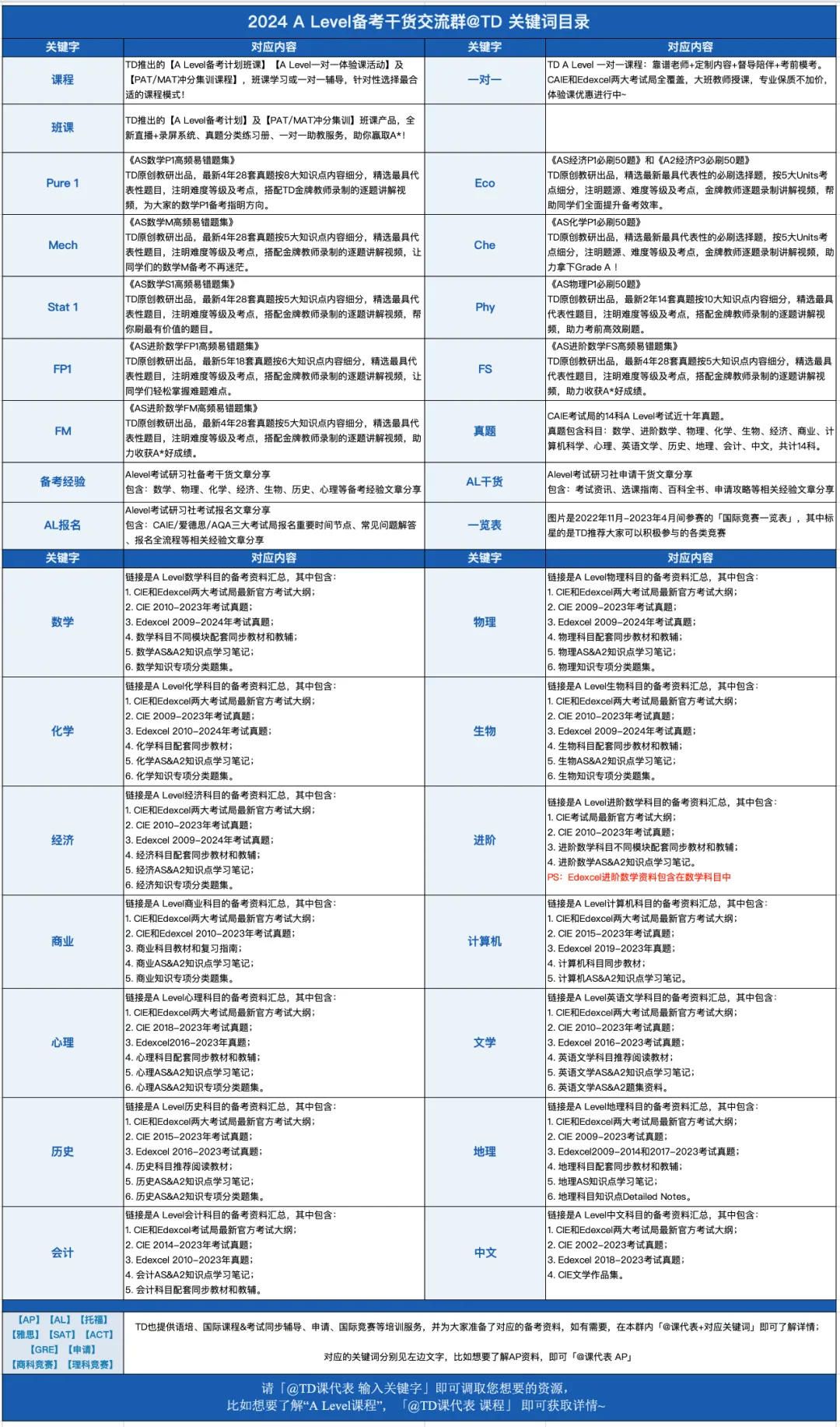 为了满足同学们A Level的备考需求,TD整理了A Level备考资料合集,囊括数学、物理、化学、经济、进阶数学、生物、商业、计算机、心理、英语文学、历史、地理、会计、中文十四大主流科目的备考资料,包含历年真题、教材教辅、学科笔记和TD独家刷题集,全方面助力备考。