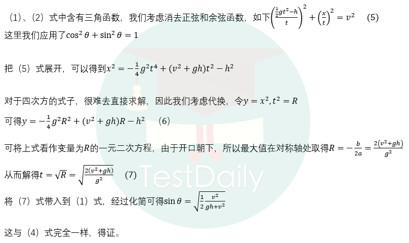 在近两年的考题中是出现过该知识点的考察的,所以大家要牢固掌握,这里我们不再复习其推导过程。如果我们把条件做少许改动,让物体从一个高度为h的平台上斜抛,那抛射角度为多少的时候,水平距离最大?