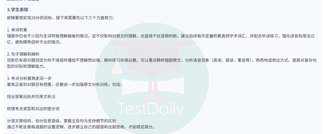 同时,她开始更加重视错题分析,在精听训练中稳步提升,整体理解力比之前更扎实。面对目的题和推断题时,也不再盲目选择,而是学会结合上下文去找答案依据。