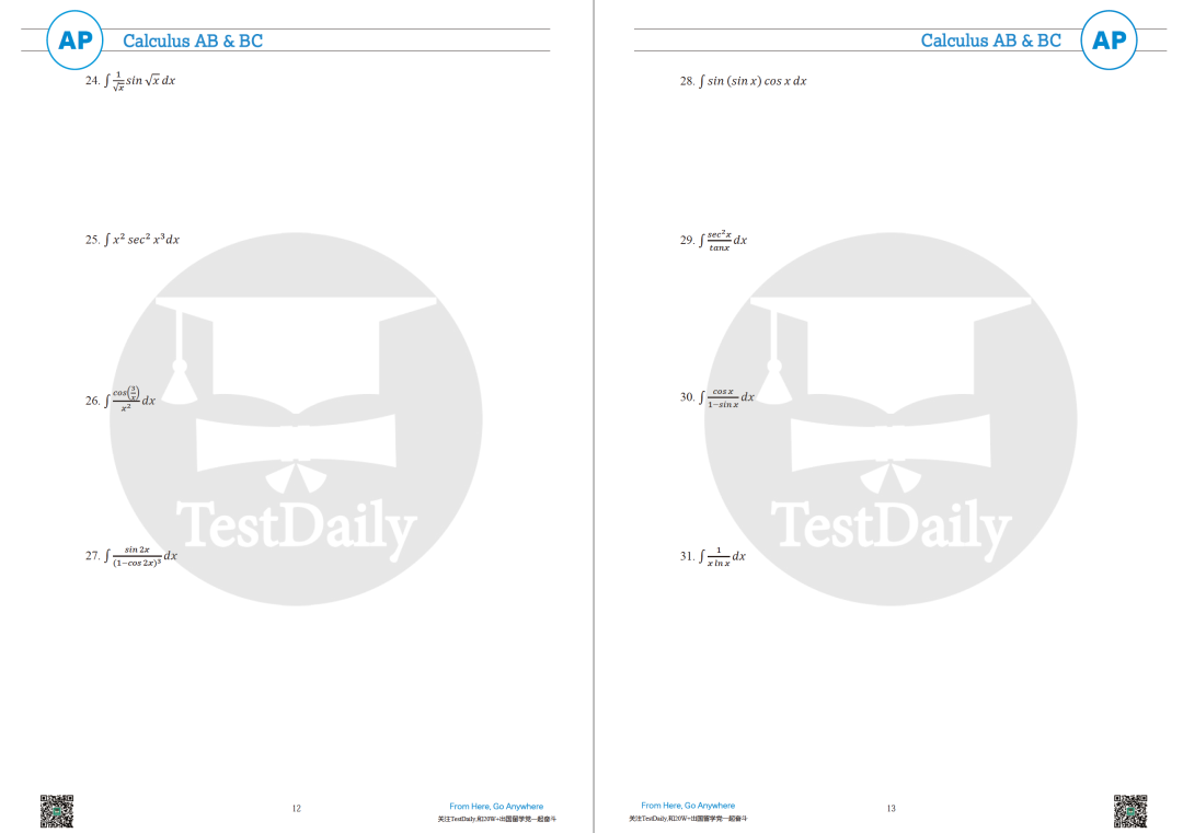 于是,TD AP微积分教研组的老师们参照官方考试大纲,遴选出了全部的求导积分计算考点,《AP微积分—求导100题》和《AP微积分—积分100题》应运而生。今年老师们对两份资料进行了重新排版优化,让《AP微积分—求导100题》和《AP微积分—积分100题》以全新的面貌出现在大家面前。