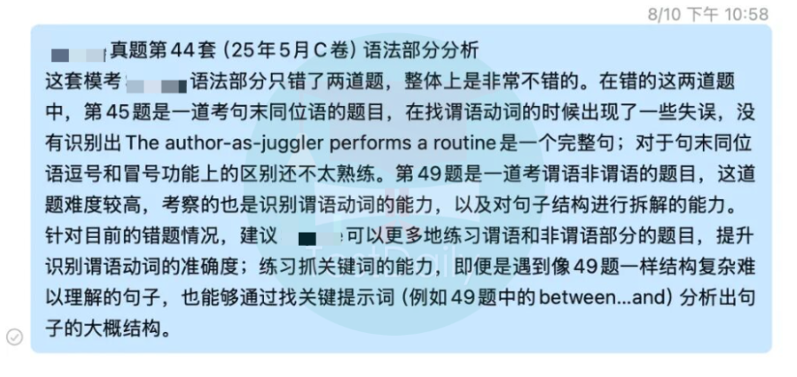 对于在国外中学或国际教育体系就读的同学而言,校内课程往往较少涉及系统的语法知识,在做题时更倾向于依靠语感而非语法规则,S同学也正是这种情况。S同学优秀的语感能够帮助她在大多数题目中保持不错的正确率,但是由于对语法规则不熟悉,在做一些坑题,对规则考查性较强的题目时,经常做错,因为区分度高的难题往往是无法单靠语感解决的。