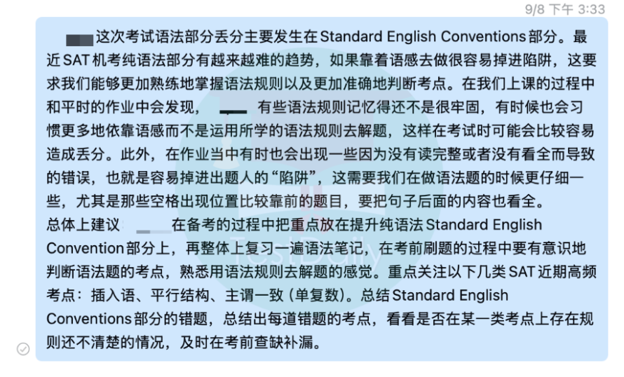 在考试前,我结合近期考试趋势与S同学自身的实际掌握情况,为她量身整理了一份“考前小清单”,从庞杂的语法规则当中筛选出三到四个最重要、S同学最易出错的核心考点,帮助她在最后阶段集中精力、高效复习。通过删繁就简,S同学能够更清晰地把握冲刺方向,实现对SAT语法部分的针对性突破。