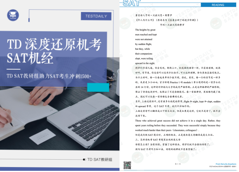我是一名民办AP国际学校的学生,从10年级升11年级的暑假第一次开始备考SAT,当时备考的时候托福112分。第一次备考时我只报名了TD的高分特训计划和点题冲分班,词汇量和阅读量还不算充分,加上真题练习不多,因此得到了一个一般的分数,1520分(扣分都在英语)。