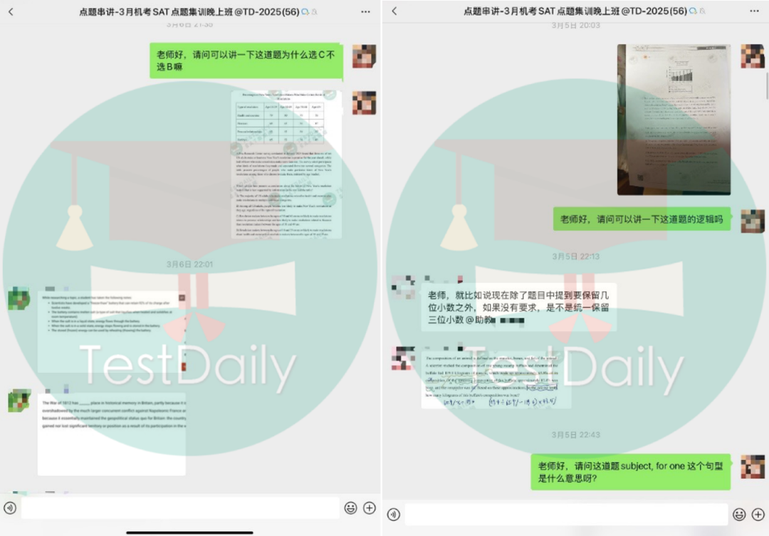 除了做题之外,TD SAT备考给我带来的最大帮助莫过于及时且详细的老师和助教答疑。作业完成后课程系统会有答疑的窗口,上传问题后一般一天左右就能收到老师的答复;如果还有困惑,还可以点击“追问”。此外,在班课结束到正式考试前,TD还会建立SAT备考答疑微信群,对于像我这样问题很多的学生特别有帮助。两次SAT考前一周,群里都会有我用错题“轰炸”助教的聊天记录!真心感谢耐心回答问题的老师们!
