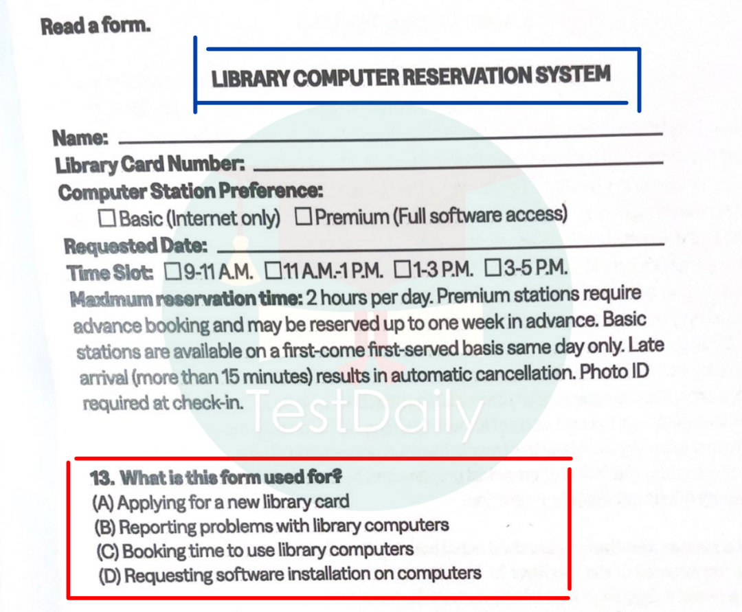 我们可以通过直接可能看表格的表头“library computer reservation system”图书馆电脑预定系统”直接判断,这个表格是用来预定图书馆的电脑的使用时间的。只要大家reservation这个单词是认识的,基本可以很快判断这道题是选C。