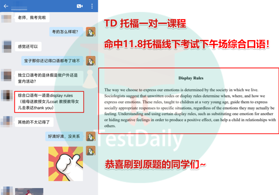TD托福一对一课程 命中11.8托福线下考试下午场综合口语!恭喜刷到原题的同学们~