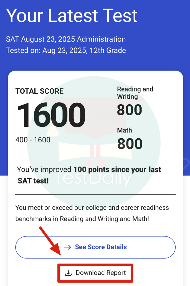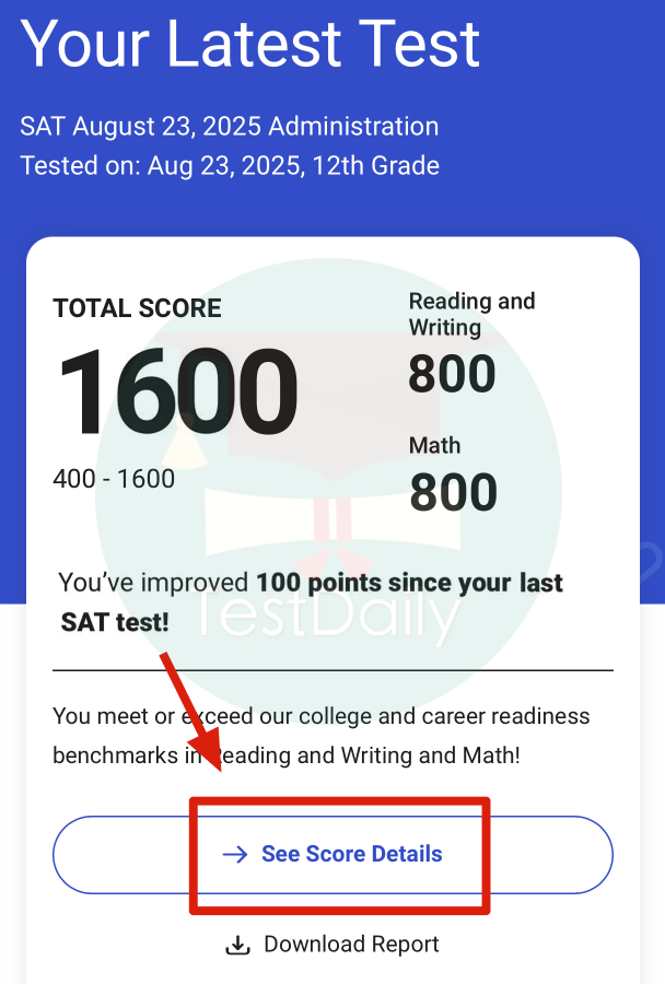 👉1)登录以下网址,输入用户名和密码,即可看到下方的报告,报告中可以看到总分以及「Reading and Writing」和「Math」的分数,点击右侧的「➡️」进入详情。