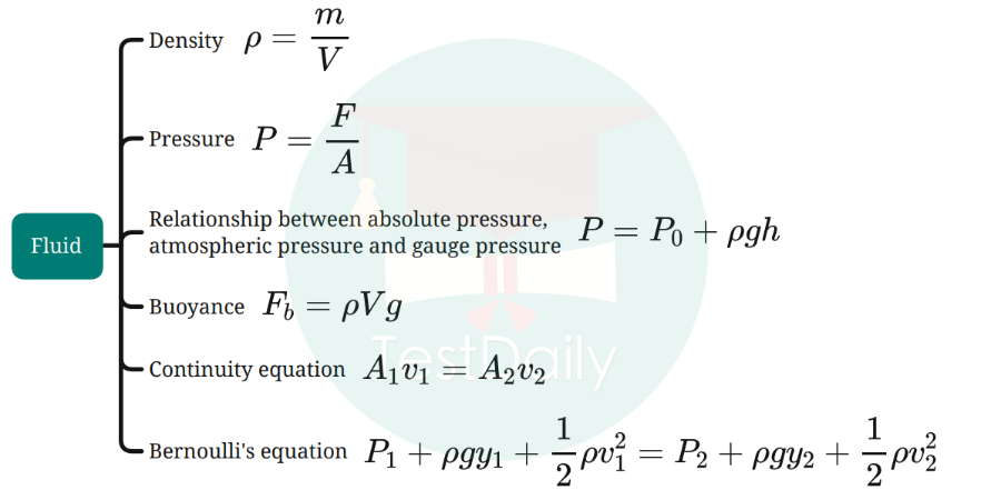 上图给我们大致展示了第一单元流体的学习内容,老师接下来要展开的常考点都会以大纲内容作为基础进行展开。 流体这一单元,同学们重点学习到的内容有密度概念、压强概念、流体静压强公式、浮力、连续性方程和伯努利方程。老师简单在这里做了下汇总,如果大家也想拿到这样的公式导图的复习资料,可以直接去文末领取。