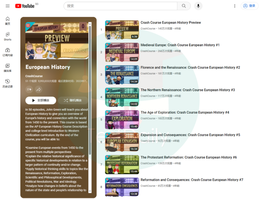 网址: https://www.youtube.com/playlist?list=PL8dPuuaLjXtMsMTfmRomkVQG8AqrAmJFX 油管上一个 提供欧洲历史速成课 的网站,每节课的时长都非常短!非常适合同学们 利用起自己碎片化的时间进行观看 。通过50集的小短片来回顾整个欧洲历史。