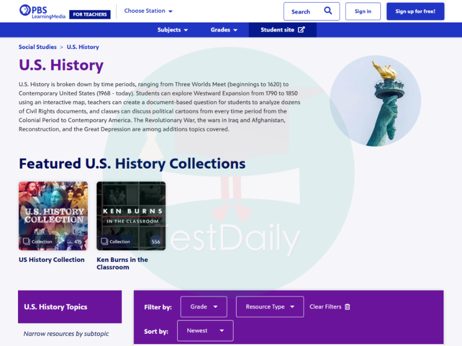 网址: https://www.pbslearningmedia.org/subjects/social-studies/us-history/?rank_by=recency 此网站为教师和学生提供 互动课程、教学视频、学习资料、音频剪辑 等内容。教师免费注册后即可使用网站内的全部工具。