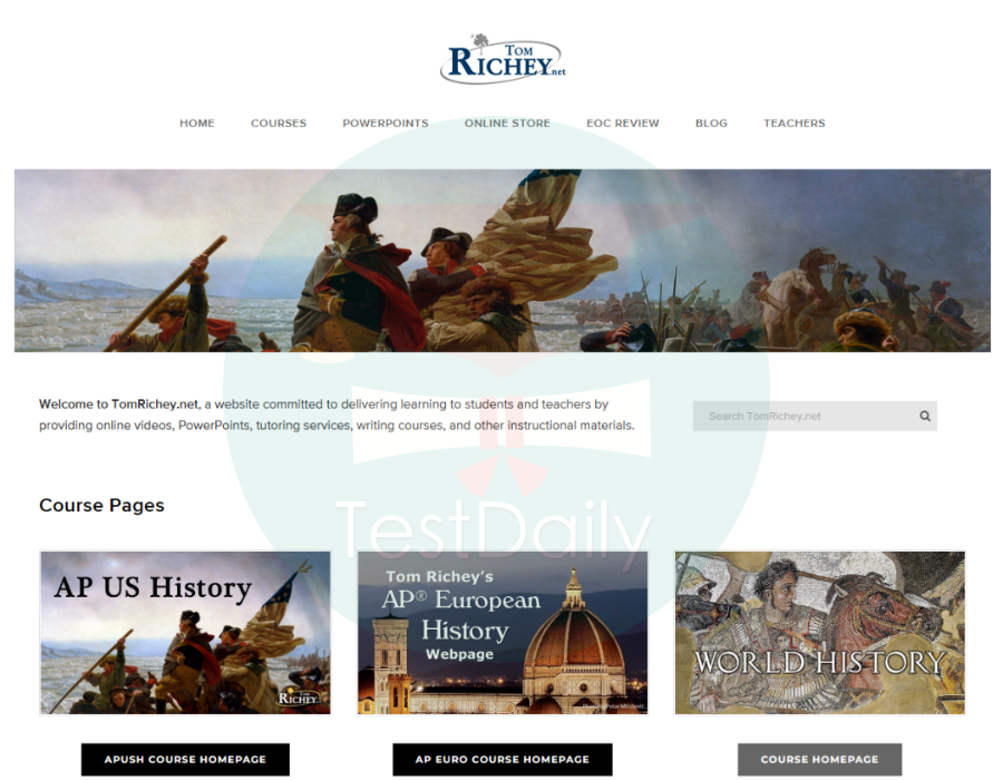 网址: https://www.tomrichey.net/ap-european-history.html 学生在网站中可以观看考试内容及方法的复习视频。这些视频可以作为 课外的拓展延伸 学习。虽然部分页面需要付费,但是大部分内容都是免费的。