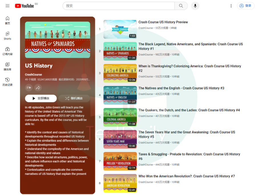 网址: https://www.youtube.com/watch?v=6E9WU9TGrec&list=PL8dPuuaLjXtMwmepBjTSG593eG7ObzO7s&index=2 油管上Crash Course不仅有欧洲历史速成课, 美国历史速成课 也同样精彩。同学们可以通过47集的小短片来回顾整个美国历史!